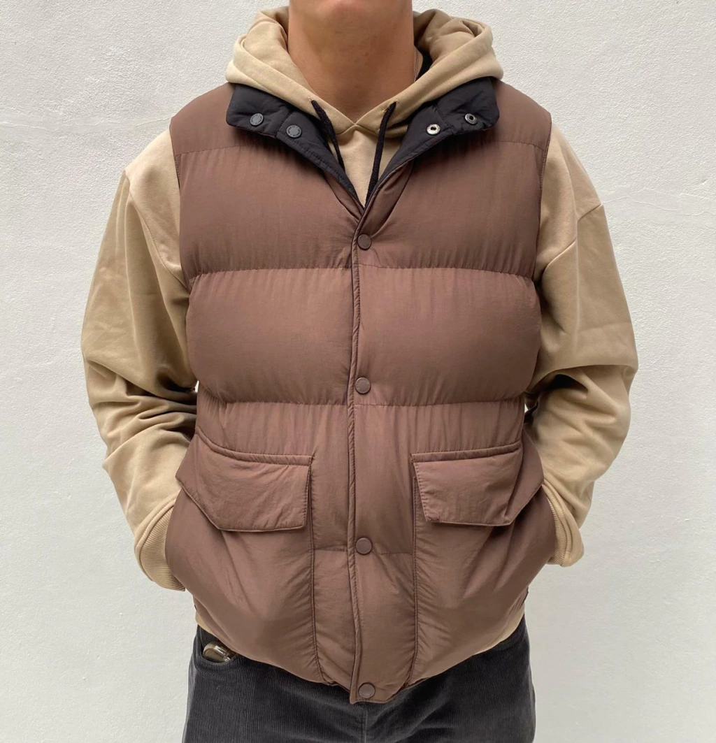 CHALECO REVERSIBLE BI-COLOR (NEGRO + MARRÓN) CON BOTONES SNAP REVERSIBLES GRABADOS.